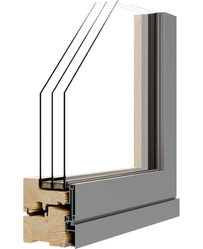 Assemblaggio del profilo in alluminio a 90° come le finestre in legno. Sezione anta ridotta per una maggiore superficie vetrata (più luce e migliore trasmittanza termica).